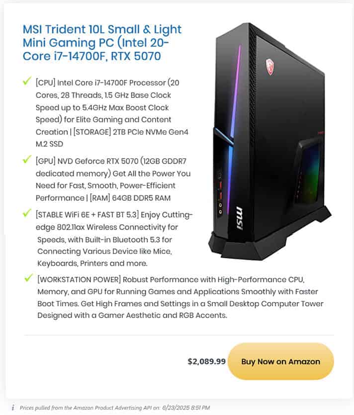The MSI Trident is a powerful small form factor desktop that offers excellent value. Packed inside the discreet 10-liter volume case is a 20-Core Intel Core i7-14700F Processor (with a max turbo frequency of 5.40 GHz), 32 GB of DDR5 RAM, and a GeForce RTX 5070 graphics card.