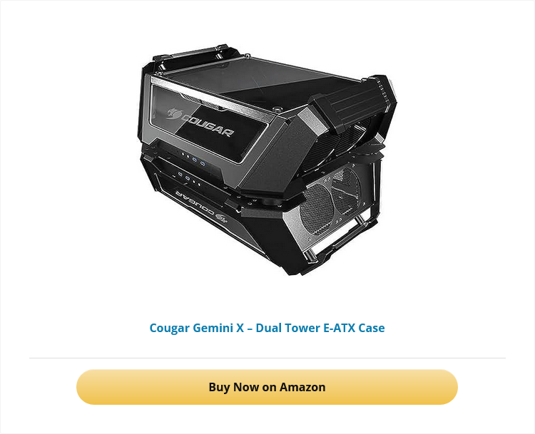 The Cougar Gemini X is a massive, dual-chamber, “Alien-looking” case that allows you to build two systems in a single enclosure. This is particularly useful for streamers who may need the extra CPU power from a dedicated PC, while still sharing the same PSU.